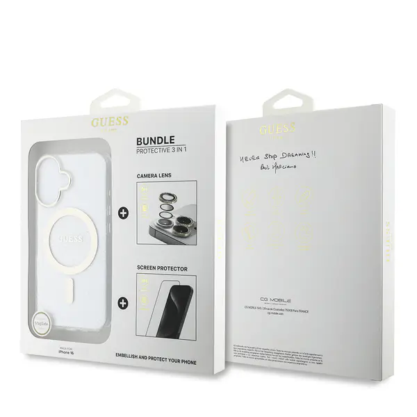 Guess IML Magsafe Case “Rhinestone Gold Lens + Screen” Θήκη προστασίας από σκληρό πλαστικό – iPhone 16 (Clear/Glitter – GUOBPLTP16SHCMCGT)