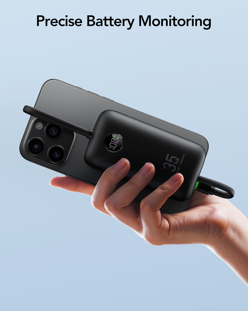 Μαύρο compact power bank 10,000mAh με ψηφιακή οθόνη μπαταρίας και ενσωματωμένα καλώδια Lightning & USB-C – Φόρτιση 35W χωρίς να χρειάζεται να κουβαλάς επιπλέον καλώδια