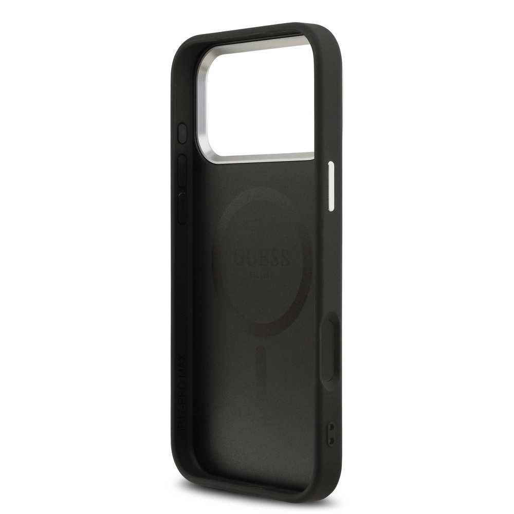 Μαύρη θήκη Guess με premium δερματίνη και εντυπωσιακό μεταλλικό logo – Συνδυάζει την κομψότητα του brand με ολοκληρωμένη προστασία και υποστήριξη MagSafe για το iPhone 17 Pro Max σου