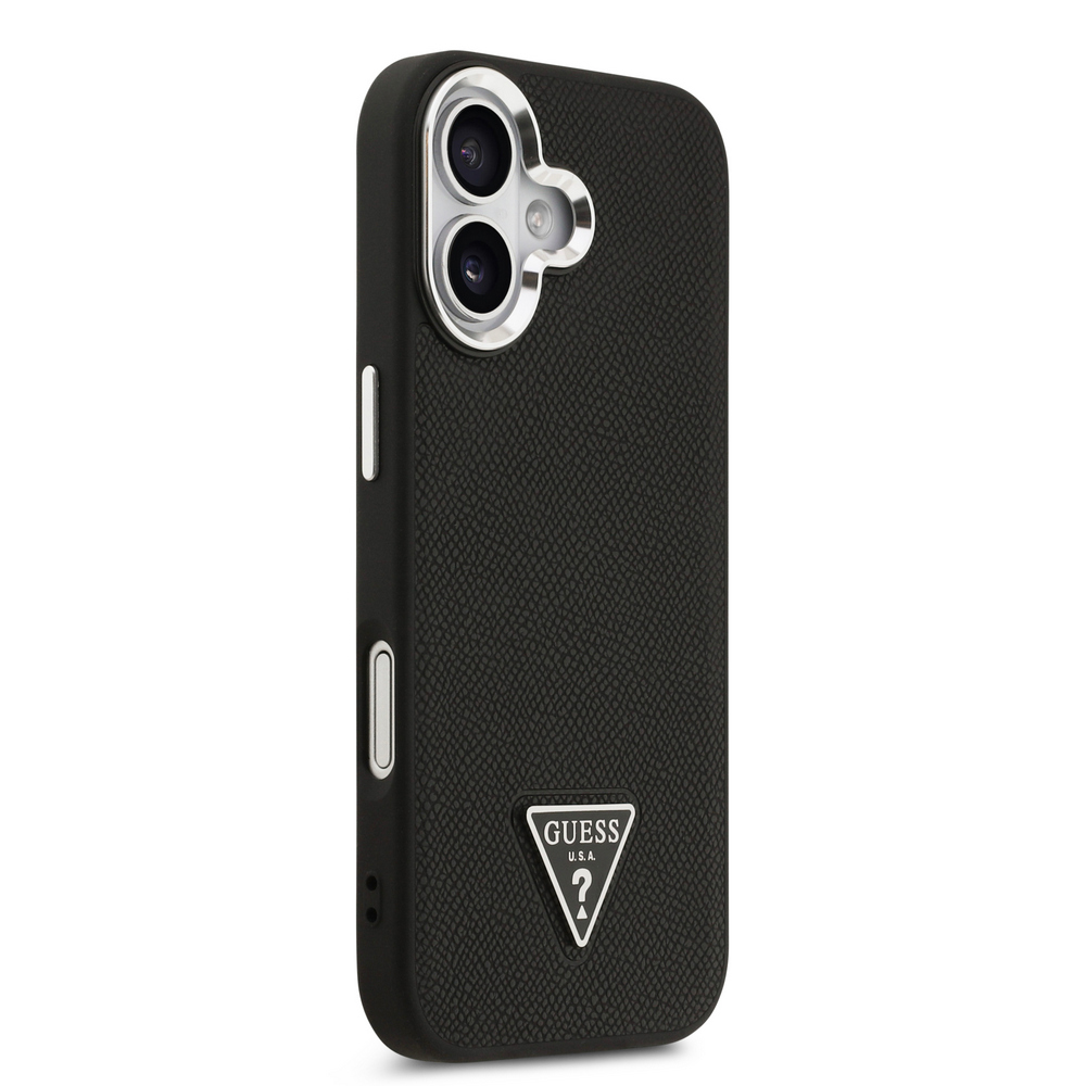 Κομψή θήκη με ανάγλυφη επιφάνεια δερματίνης και εμβληματικό metal triangle logo της Guess – Συνδυάζει προστασία με premium αισθητική για το iPhone 17 σου