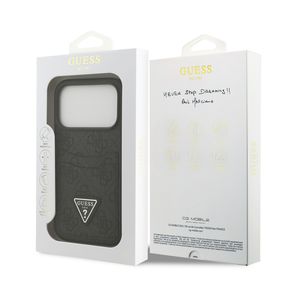 Κομψή θήκη Guess με χαρακτηριστικό τρίγωνο logo σε ανάγλυφο μαύρο σχεδιασμό με δύο θήκες καρτών – Συνδυάζει την υψηλή αισθητική με πρακτικότητα για το iPhone 17 Pro