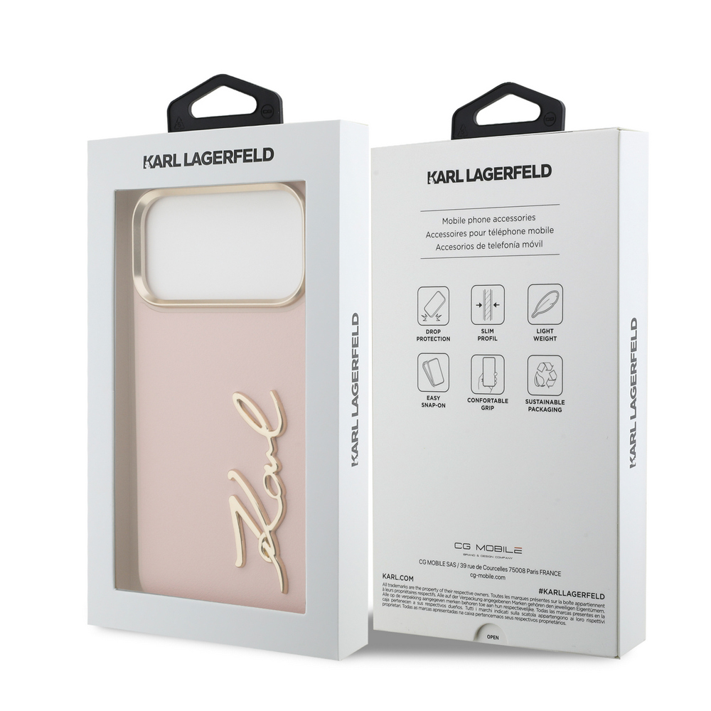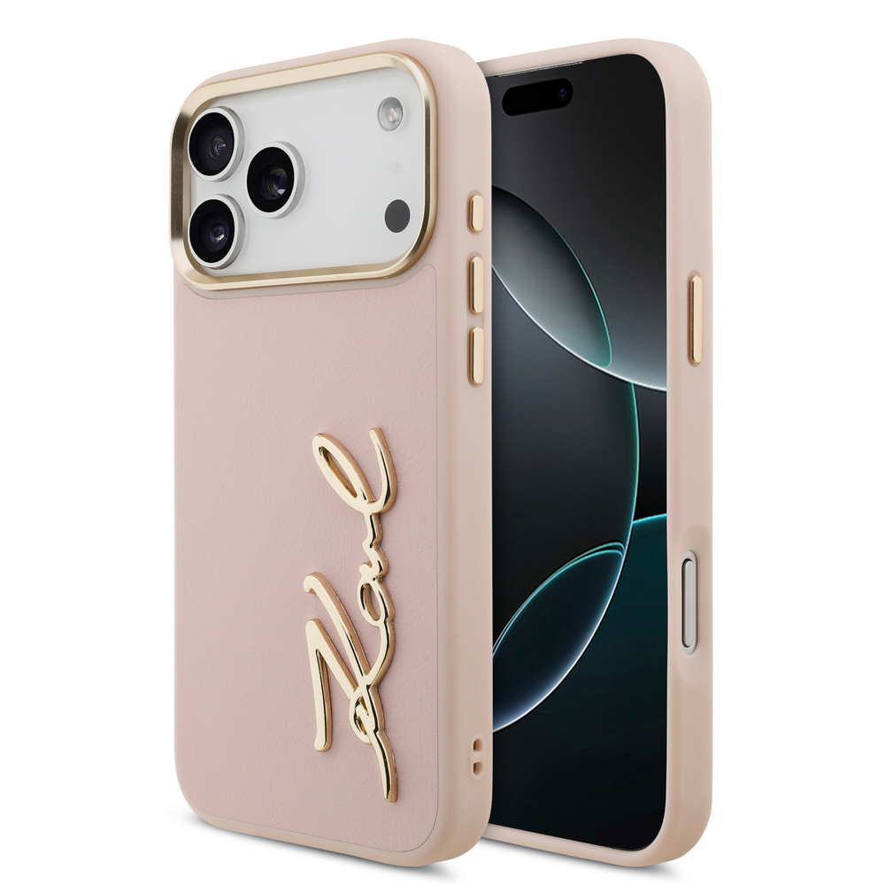 Θήκη Karl Lagerfeld Magsafe με χρυσή μεταλλική ανάγλυφη υπογραφή Karl και χρυσά πλαινά κουμπιά για iPhone 17 Pro Max ροζ