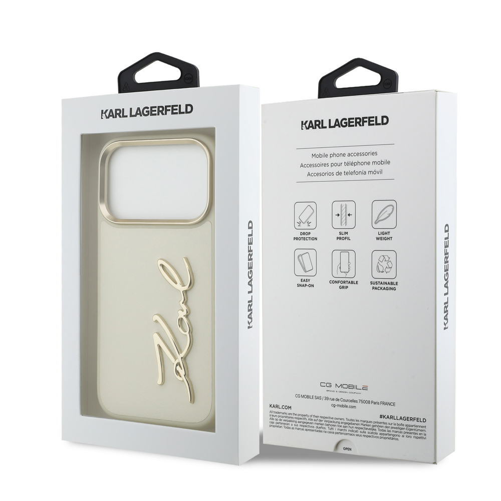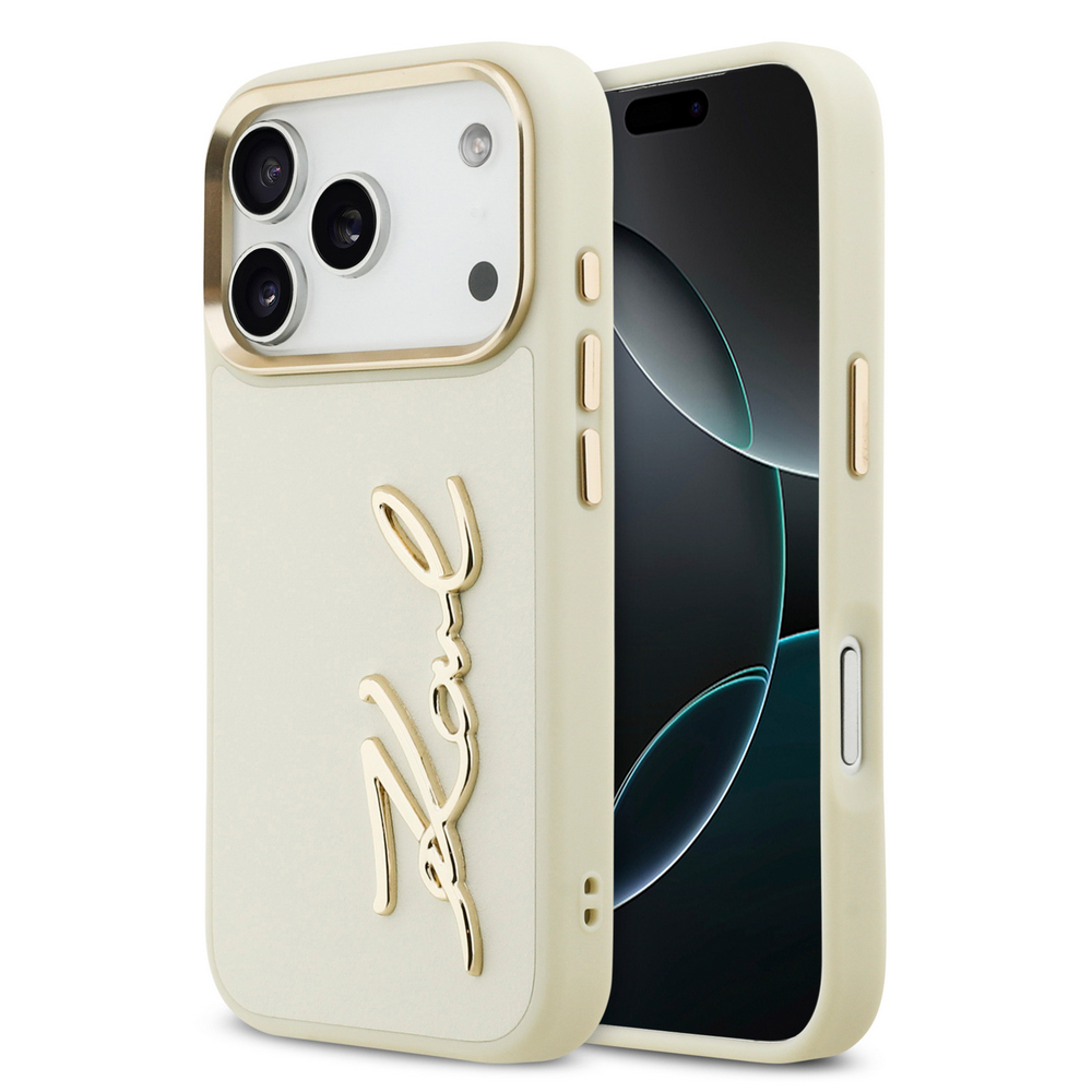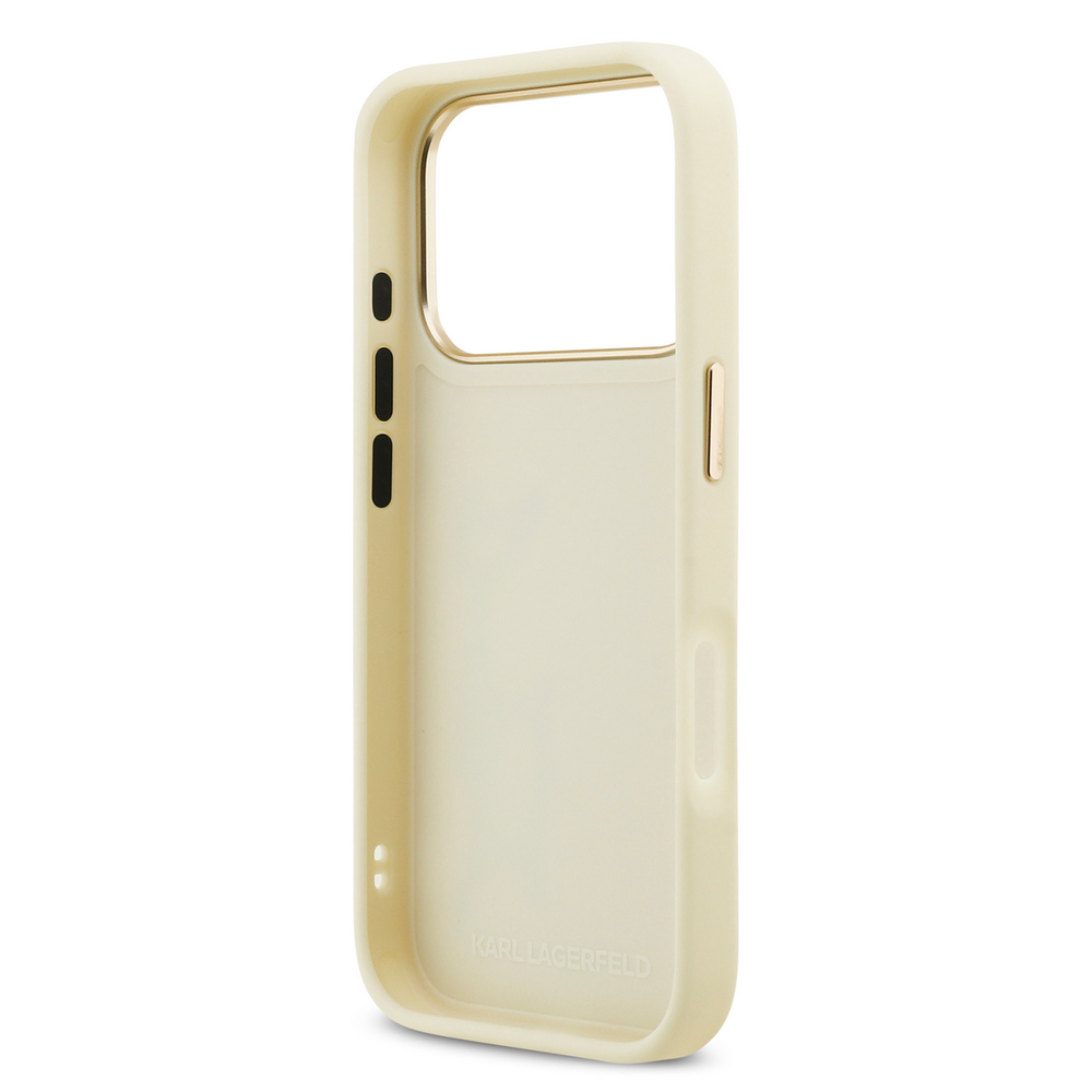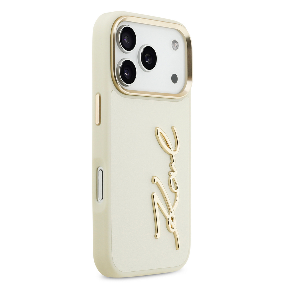 Θήκη Karl Lagerfeld Magsafe με χρυσή μεταλλική ανάγλυφη υπογραφή Karl και χρυσά πλαινά κουμπιά για iPhone 17 Pro μπεζ