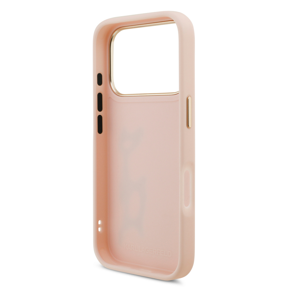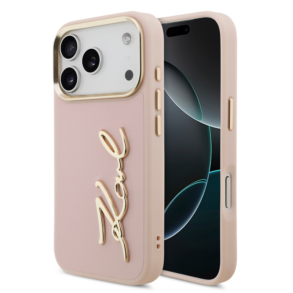 Θήκη Karl Lagerfeld Magsafe με χρυσή μεταλλική ανάγλυφη υπογραφή Karl και χρυσά πλαινά κουμπιά για iPhone 17 Pro ροζ