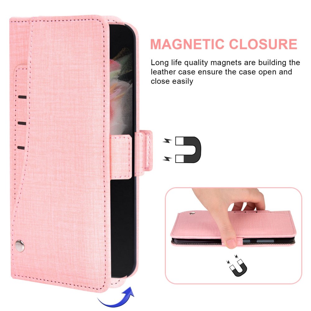 Θήκη Samsung Galaxy Z Fold4 5G Mad Mask Jean Cloth Texture με βάση στήριξης, μπροστινές υποδοχές καρτών και μαγνητικό κούμπωμα ροζ