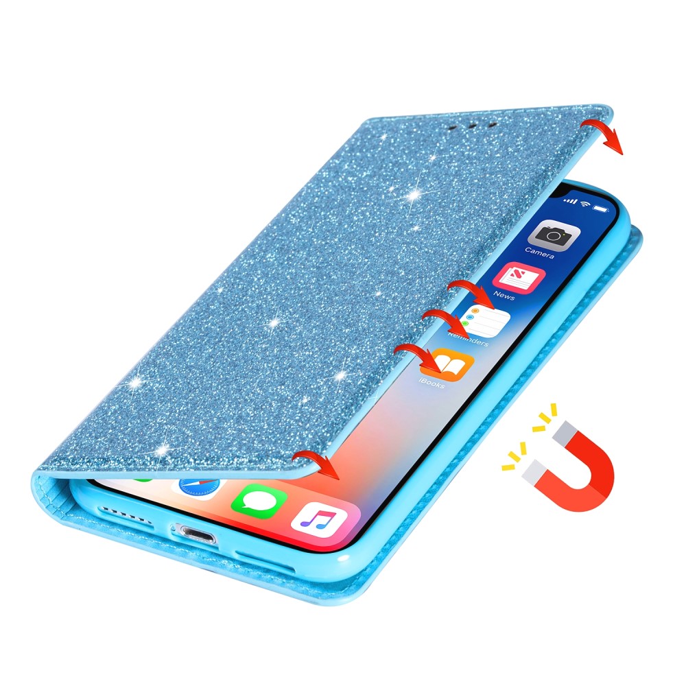 Θήκη Samsung Galaxy A41 OEM Skin Glitter Series με βάση στήριξης, υποδοχή καρτών και μαγνητικό κούμπωμα Flip Wallet από συνθετικό δέρμα και TPU γαλάζιο