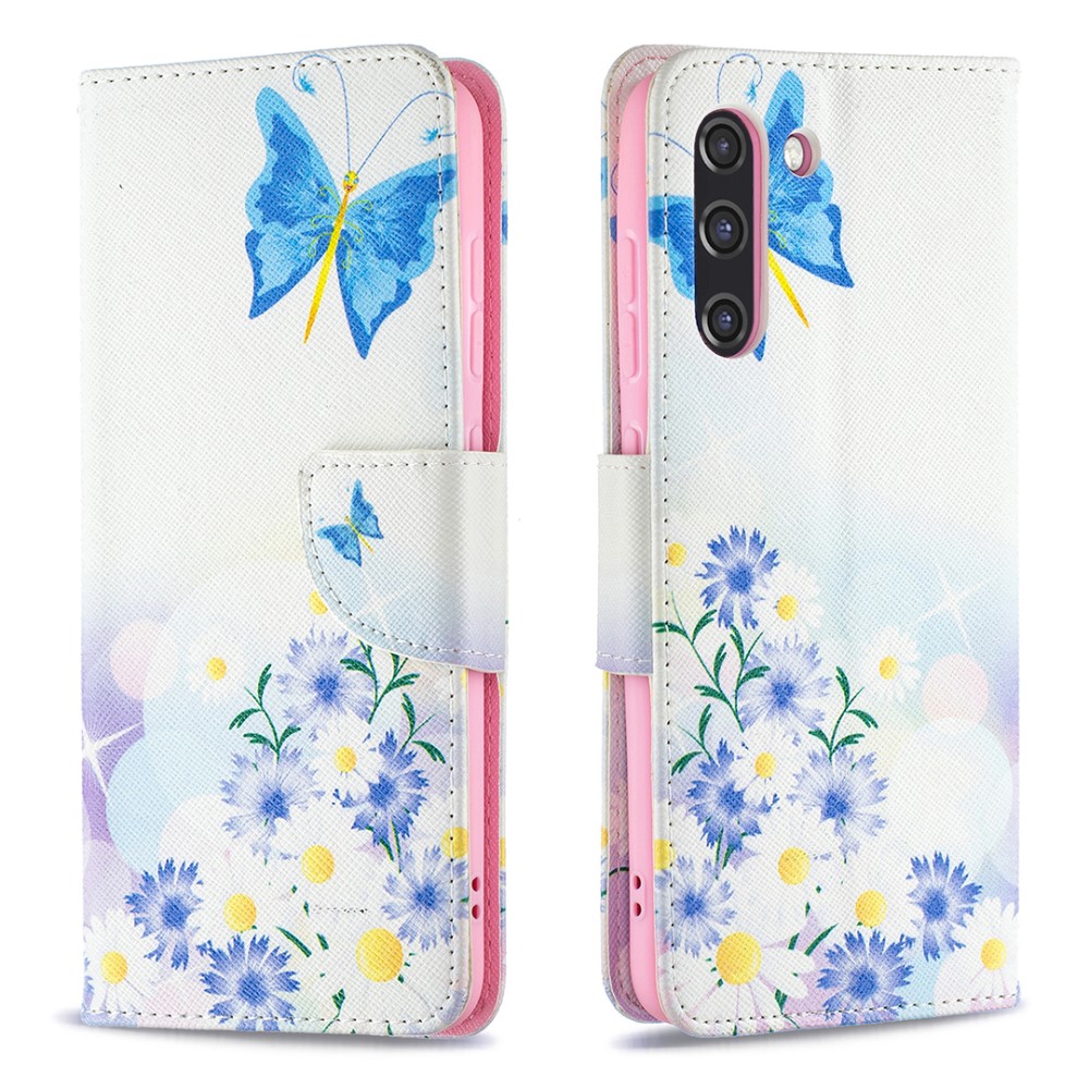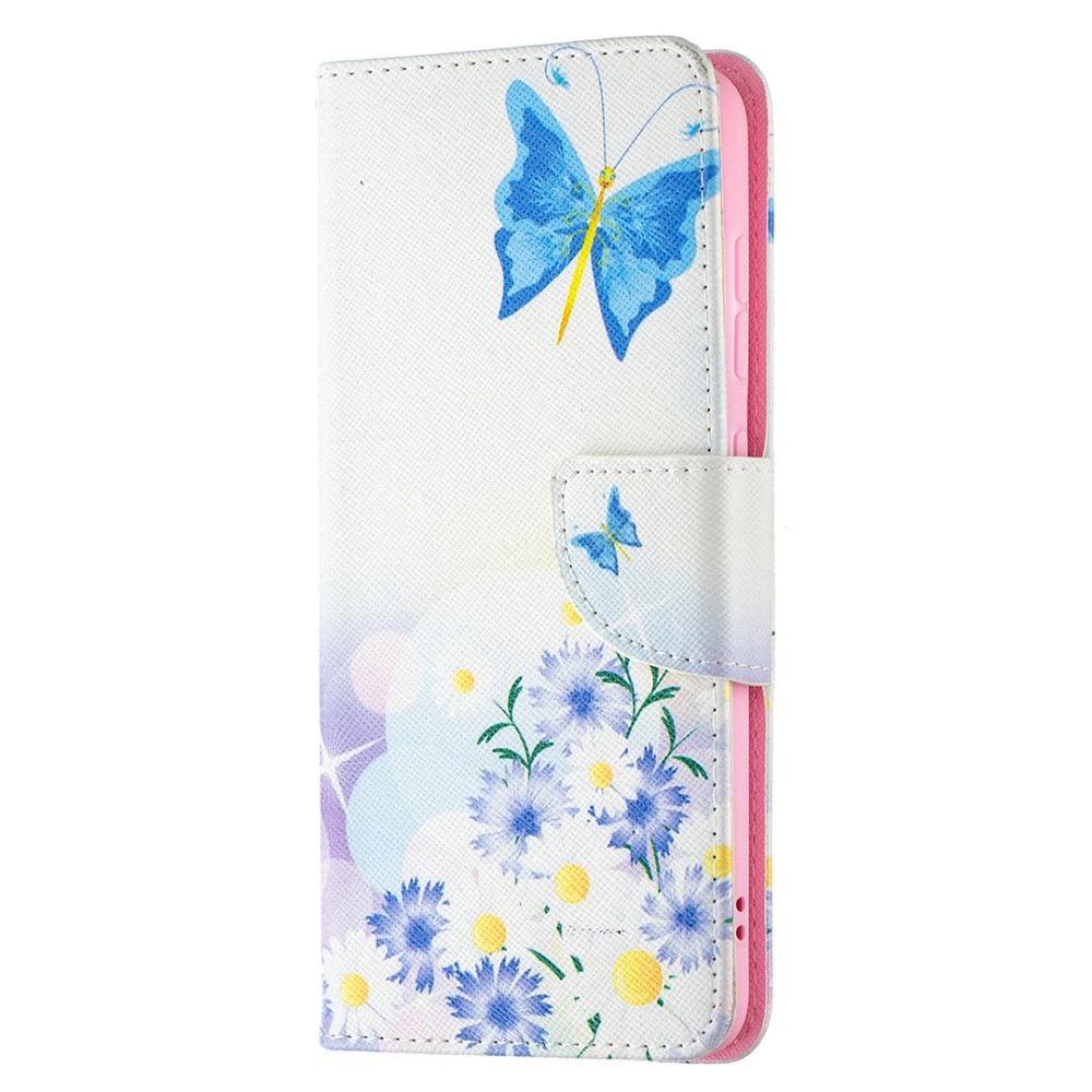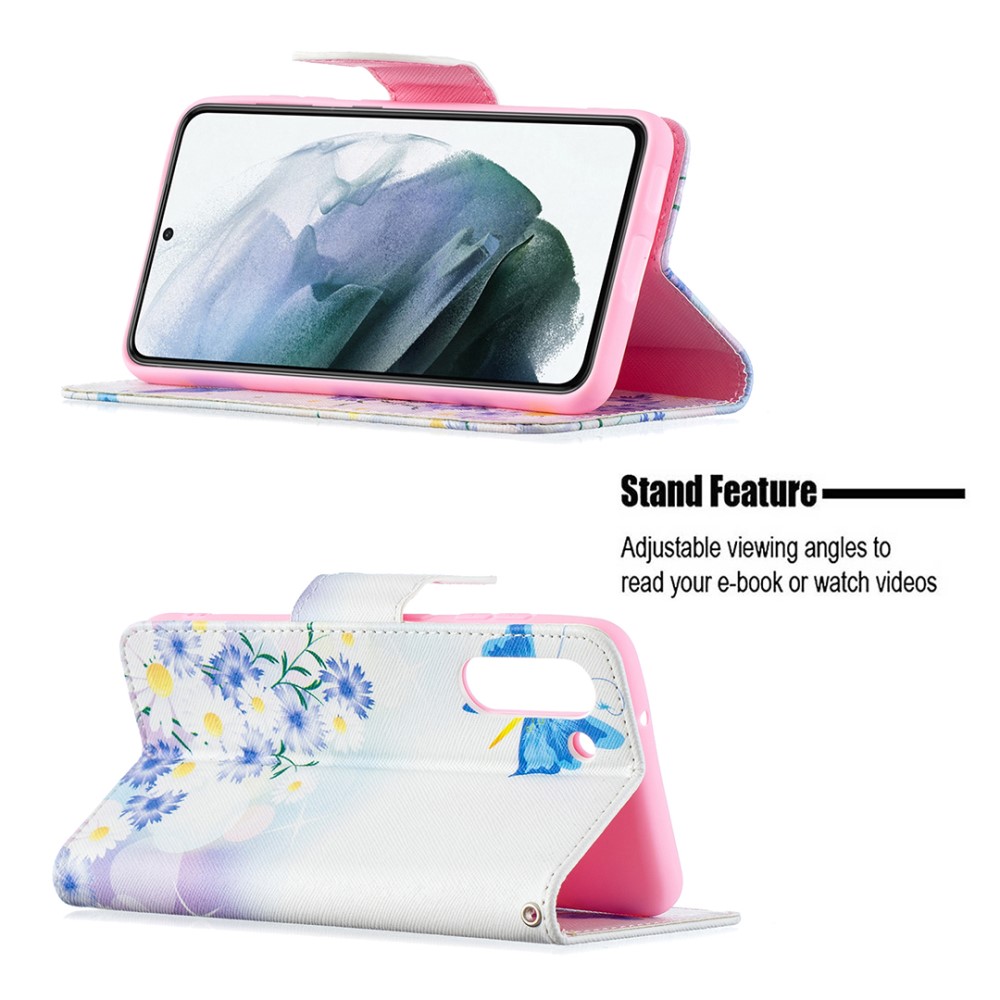 Θήκη Samsung Galaxy S21 FE OEM Blue Butterfly & Flowers με βάση στήριξης, υποδοχές καρτών και μαγνητικό κούμπωμα Flip Wallet από συνθετικό δέρμα και TPU