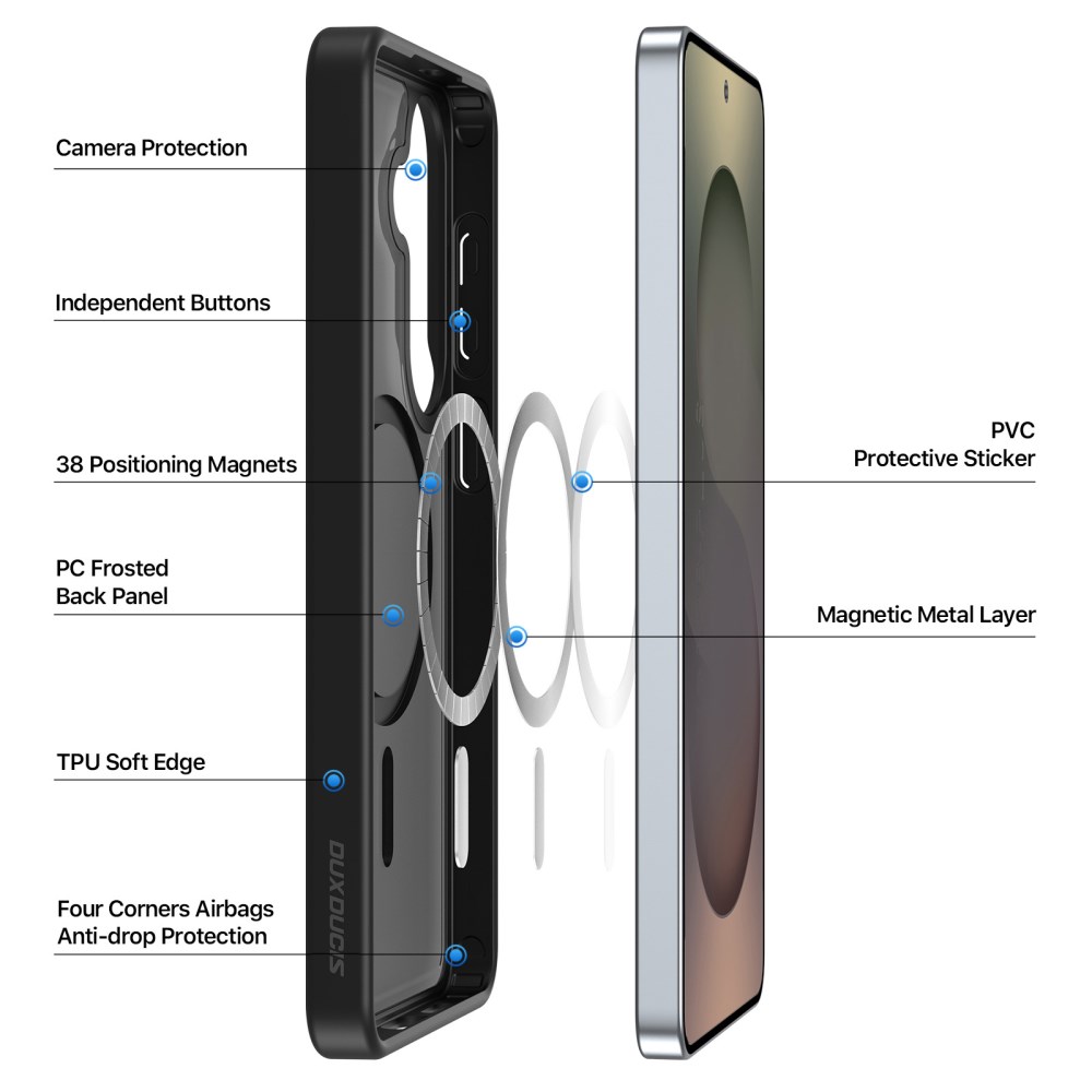 Η Σκληρή Πλάτη PC+TPU για το Samsung Galaxy S26 5G από τη σειρά DUX DUCIS Yind Series συνδυάζει εξαιρετική ανθεκτικότητα με κομψό μαύρο φινίρισμα. Τα μαλακά άκρα TPU με skin-friendly matte επιφάνεια και η σκληρή πλάτη PC εξασφαλίζουν άνετο κράτημα και αποτελεσματική προστασία. Ενσωματωμένοι 38 ισχυροί μαγνήτες εξασφαλίζουν πλήρη συμβατότητα με magnetic chargers, magnetic car mounts και άλλα μαγνητικά αξεσουάρ.