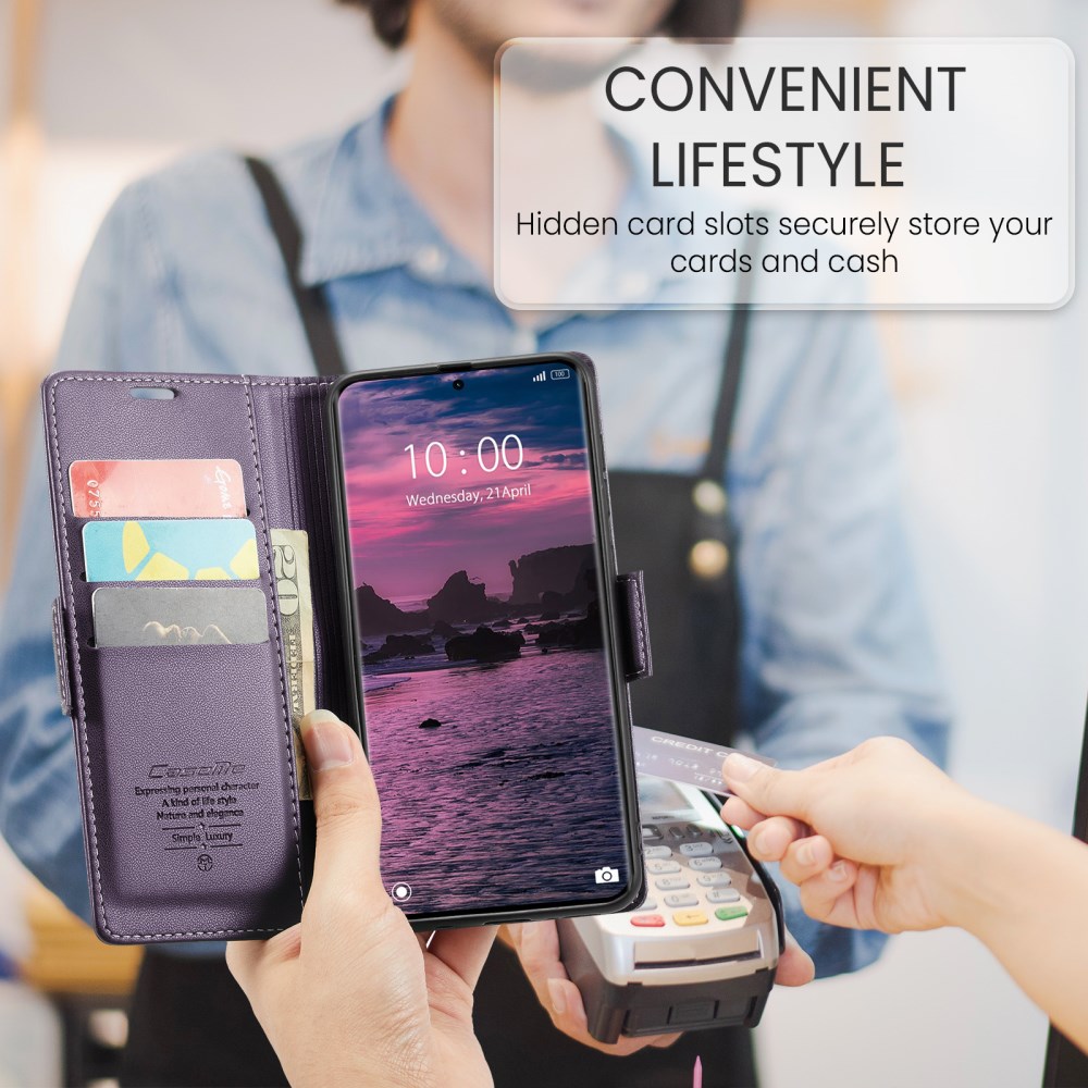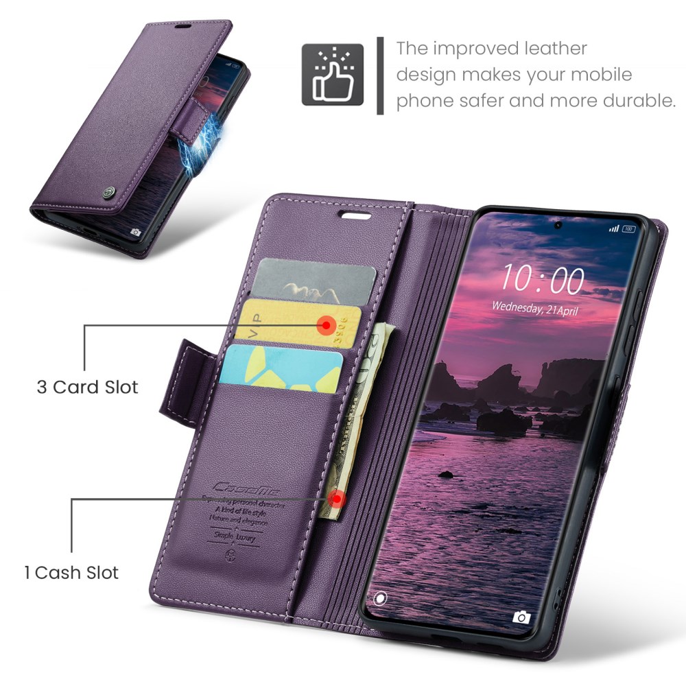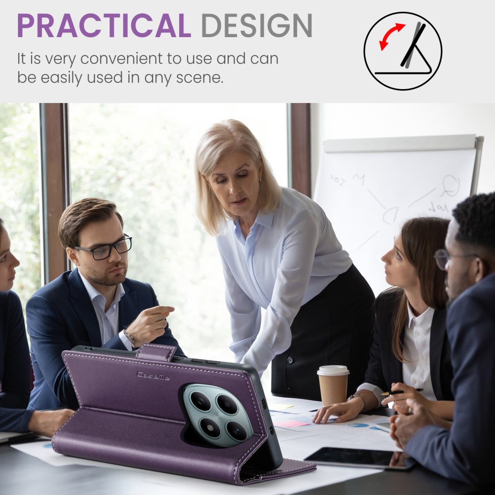 Το Flip Πορτοφόλι από Συνθετικό Δέρμα (PU) με TPU της σειράς CASEME 023 σε κομψό Μωβ χρώμα είναι σχεδιασμένο αποκλειστικά για το Xiaomi Redmi Note 15 5G / Poco M8 5G / Redmi Note 15 4G. Η εξωτερική επιφάνεια από συνθετικό δέρμα (PU) με υφή litchi και γυαλιστερό φινίρισμα συνδυάζεται με εσωτερικό κέλυφος TPU για ολοκληρωμένη προστασία από κρούσεις και γρατζουνιές.