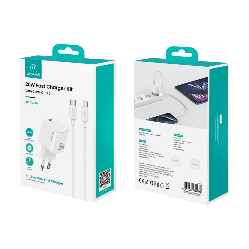 USAMS Fast Charger Kit 1 x φορτιστής JO Series Power Delivery (PD) 20W Fast Charger με 1 x Type-C και καλώδιο 1m 60W USB-C σε USB-C (JOXLTZ04) – λευκός